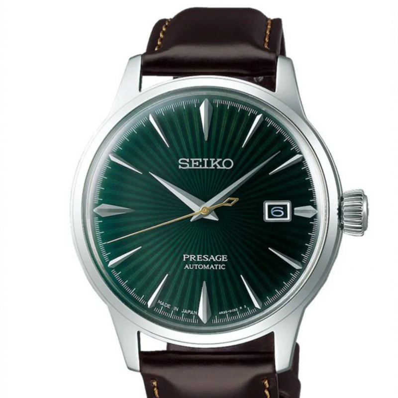 The Seiko Presage SRPD37J1 "Mockingbird” draws inspiration from the classic cocktail of the same name. Its vibrant green sunray dial and box-shaped Hardlex crystal create a retro-modern elegance. Powered by the 4R35 automatic movement with a 41-hour power reserve, this 40.5mm timepiece features a see-through case back, date display, and is paired with a supple brown leather strap. A refined accessory for both work and after-hours style.